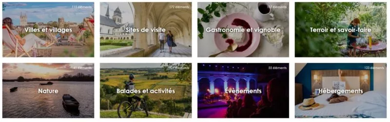 - des photographies illustrant les villes et villages de l'Anjou, les sites de visite, le vignoble et la gastronomie, la nature, les balades et activités, les événements et hébergements de l'Anjou,